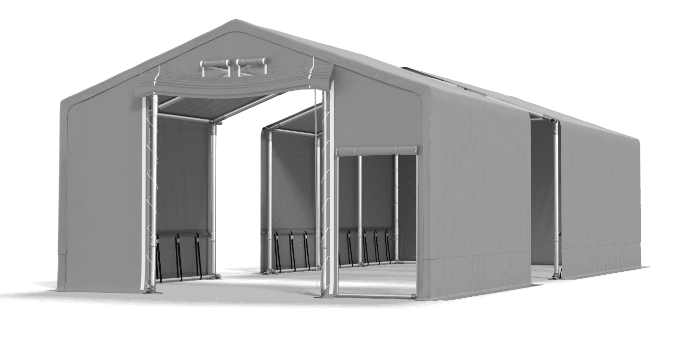 Eine vollständige, graue Plane aus PVC mit hohem Gewicht isoliert perfekt Waren und atmosphärische Fahrzeuge, die unter dem Dach gelagert werden. Ein starkes Jahr -Rund -Planin ist mit einem zusätzlichen kleineren Input ausgestattet, der sich neben dem großen Eingangstor befindet. Dies ist ein ausgezeichnetes Lagerzelt und ein solides Garagenzelt. Mit wasserdichtem und hartem Umhäuschen können Sie Workshop und Produktion in der Zelthalle durchführen.