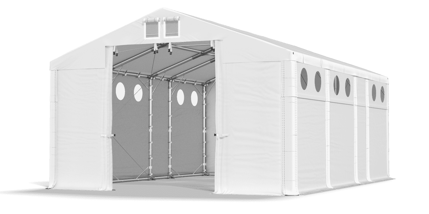Die Umformung mit beleuchteten Fenstern garantiert die Versorgung des täglichen Lichts für das Innere des Lagerzeltes. Solid Tarpaulin PVC ist gegen Feuchtigkeit und UV -Strahlung resistent. Unter dem Dach können Sie Waren aufbewahren, Reparaturen durchführen und Arbeiten im Zusammenhang mit Produktion und Segregation ausführen. Die Ummantelung wurde mit einem System mit einer einfachen Längenänderung Multi-size ausgestattet. Kleine, runde Fenster werden im oberen Teil der Seitenwände platziert, weshalb der Innenraum des Garagenzeltes für Zuschauer nicht sichtbar ist.