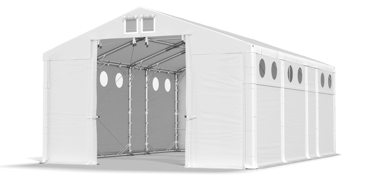 Diese Art der Abdeckung ist ab einer Höhe von 2,5 m erhältlich. Im oberen Teil des Zeltes sind runde Fenster angebracht. Dies ist eine großartige Lösung für Werkstattzelte, in denen Sie Beleuchtung benötigen, aber nicht möchten, dass Ihre Arbeit für Außenstehende sichtbar ist.