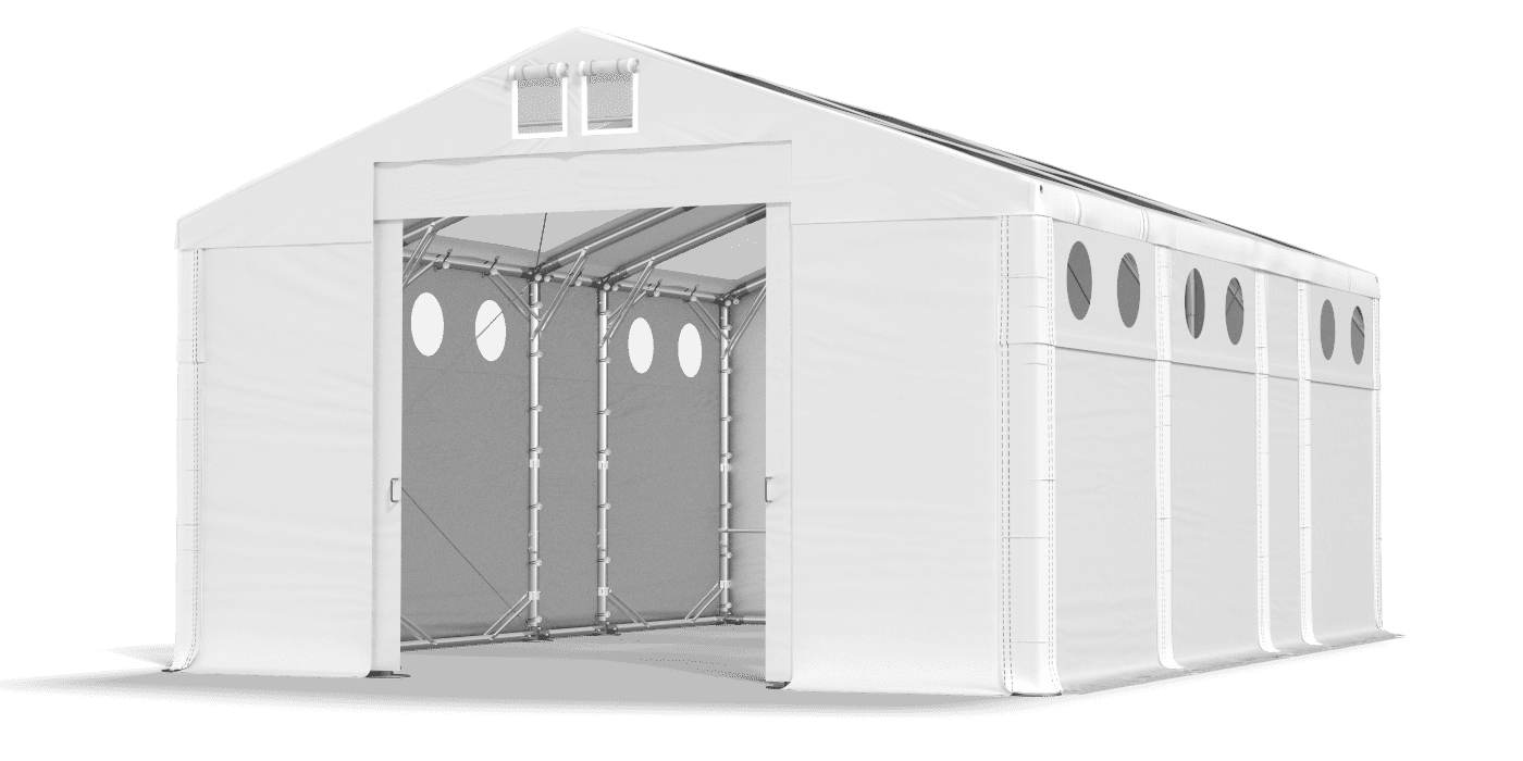 Die Plane ist mit kleinen Lichtfenstern und einem transparenten Dach ausgestattet. Dank dessen ist das Innere des Lagerzeltes gut beleuchtet und gleichzeitig für Außenstehende unsichtbar. Die Ummantelung besteht aus dauerhafter PVC, die gegen Feuchtigkeit und UV -Strahlung beständig sind. Mit einem engen Garagenzelt können Sie gewerbliche Waren, Sportgeräte und Fahrzeuge aufbewahren. Unter dem Dach können Arbeiten im Zusammenhang mit Montage, Produktion und Segregation durchgeführt werden. Die Ummantelung wurde mit einem System mit einer einfachen Längenänderung Multi-size ausgestattet.