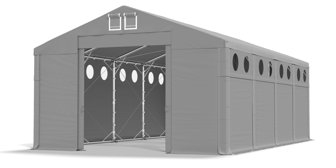 Die Ummantelung mit runden Lichtfenstern besteht aus starker PVC. Die Plane ist wasserdicht, dicht und gegen UV -Strahlung beständig. In einem Lagerzelt können wir gewerbliche Waren, Fahrzeuge, Renditen und Baumaterialien aufbewahren. Kleine Fenster sorgen für den Innenraum der Zelthalle. Sie werden im oberen Teil der Seitenwände platziert, weshalb der Dachgehalt für Zuschauer unsichtbar ist. Die Plane hat ein Schnelllängenwechselsystem Multi-size.