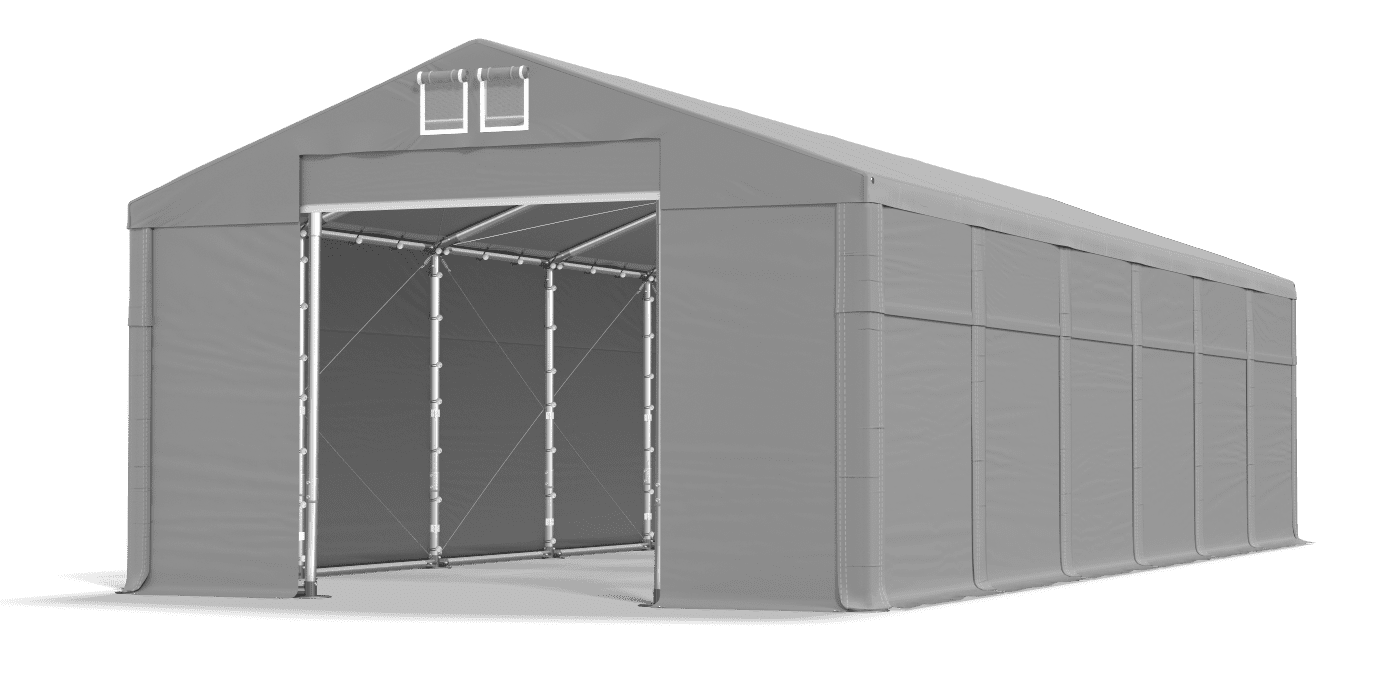 Langlebig, hart -tarpaulin -Tarpaulin aus PVC bietet sichere Bedingungen für die Aufbewahrung von Baumaterialien, Gewerbegütern, Fahrzeugen und landwirtschaftlichen Maschinen. Die volle Wendung ohne Fenster ist extrem eng, wasserdicht und besteht nicht über das Tageslicht. Das Innere des Lagerzeltes ist für Zuschauer unsichtbar. Dies ist ein ausgezeichnetes Garagenzelt und Industriehalle. Die Plane hat ein Schnelllängenwechselsystem Multi-size.