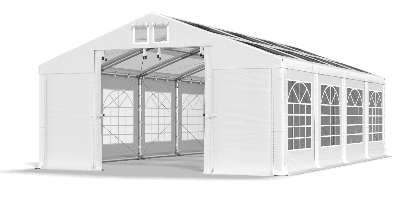 Die mit Buntglasfenstern ausgestattete Plane und ein transparentes Dach sorgt für eine optimale Beleuchtung von Tischen und Buffets während eines Partyzeltes. Starke Ummantelung mit PVC schützt vor Feuchtigkeit, Wind und UV -Strahlung. Für die Veranstaltung können Sie Familienfeiern, Firmenbankette, Festivals und Ausstellungen organisieren. Es ist auch ein ausgezeichnetes Gartenzelt und ein kommerzielles Zelt. Die Ummantelung wurde mit einem System mit einer einfachen Längenänderung Multi-size ausgestattet.