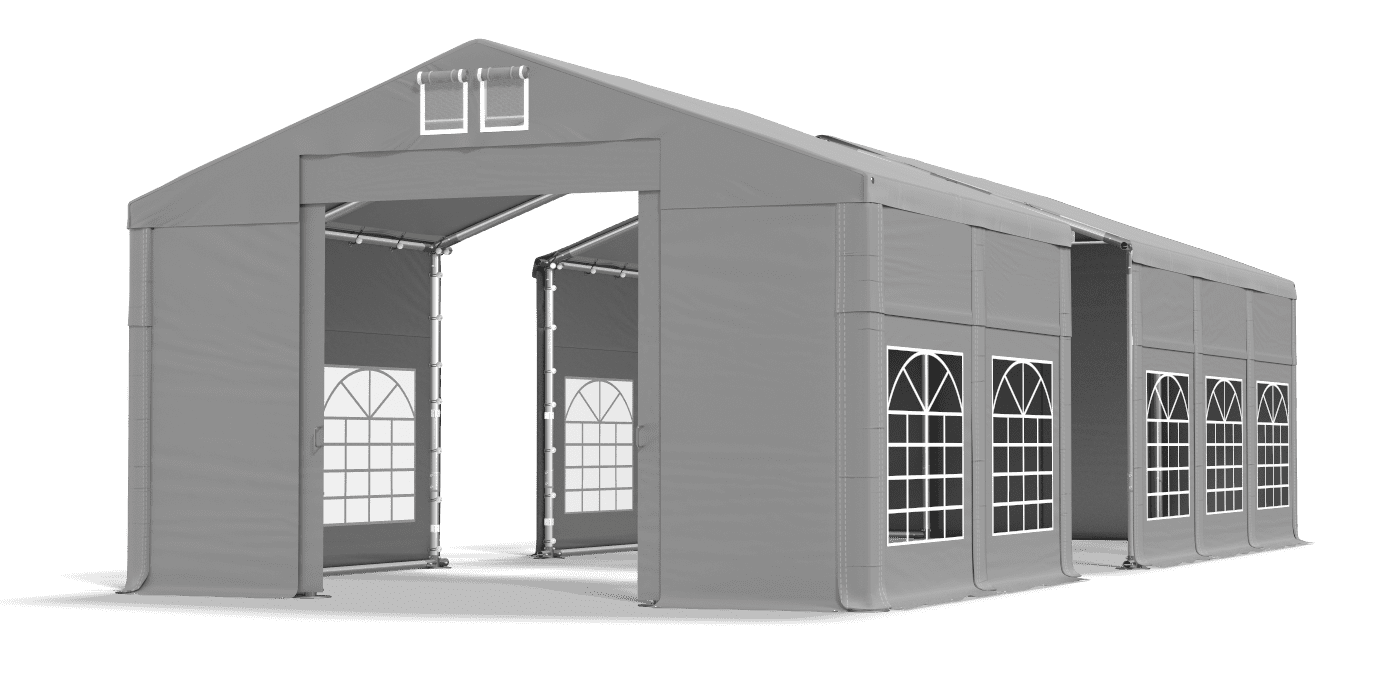 Die Seitenwand besteht aus dicker Plane PVC ca. 500 g/m² und große Sprossenfenster. Die Höhe der Grundwand beträgt 2m. Dank des einzigartigen Designs ist es möglich, die Seitenwand problemlos um 0,5 m oder 1 m anzuheben. Dank der in jedem Zwei-Meter-Segment angebrachten Fenster sieht das Zelt ästhetisch ansprechend aus. Es eignet sich perfekt als Gewerbe-, Ausstellungs- oder Partyzelt.