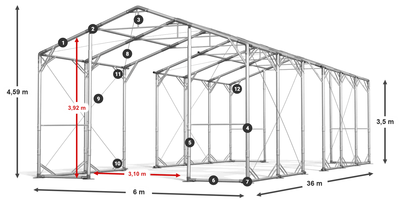 Die Struktur besteht aus einem starken und soliden Rahmen, aus verzinktem Material Rohre ca. fi 50 mm. Der Rahmen ist einfach zu montieren. Dadurch kann das Zelt neben der schnellenMontage auch sehr schnell dorthin gebracht werden, wo es benötigt wird.