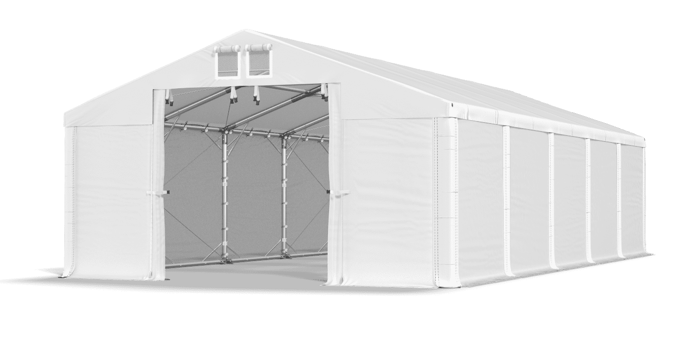 Langlebig, hart -tarpaulin -Tarpaulin aus PVC bietet sichere Bedingungen für die Aufbewahrung von Baumaterialien, Gewerbegütern, Fahrzeugen und landwirtschaftlichen Maschinen. Die volle Wendung ohne Fenster ist extrem eng, wasserdicht und besteht nicht über das Tageslicht. Das Innere des Lagerzeltes ist für Zuschauer unsichtbar. Dies ist ein ausgezeichnetes Garagenzelt und Industriehalle. Die Plane hat ein Schnelllängenwechselsystem Multi-size.